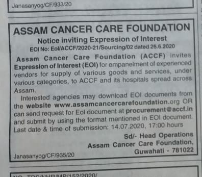 | ACCF/Insurance/2023-24/75 | EOI for group health insurance for Assam Cancer Care Foundation employees and their family members | — | 15-Feb-2024 | Bid document | |