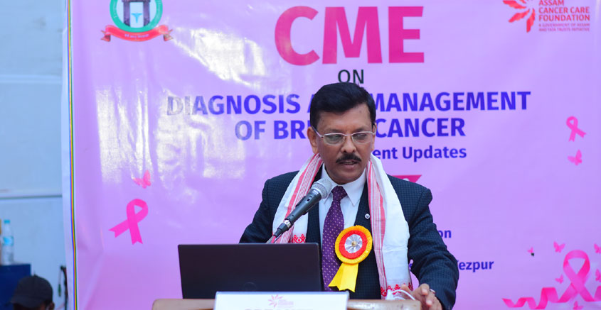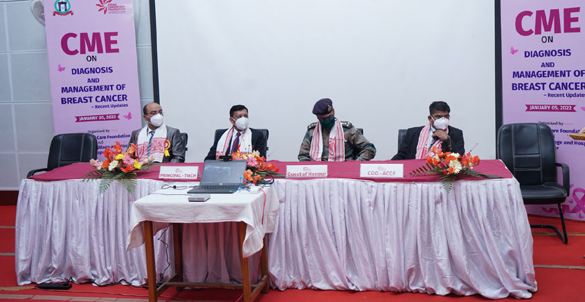 Assam Cancer Care Foundation and Tezpur Medical College and Hospital (TMCH), organised a CME on Diagnosis and Management of Breast Cancer – Recent Updates at the TMCH auditorium on January 05, 2022. Prof. (Dr) Karuna Hazarika, MD, DMRD Principal cum Chief Superintendent, TMCH, Dr Madhab Rajbongshi, Med Superintendent, TMCH, Dr Deepak Mishra, Director Lab Services, Tata Medical Centre, Kolkata, Dr (Col) Sajal Sen, Chief Operating Officer, ACCF, Dr. Venkata Pradeep Babu Koyyala, Sr. Consultant Medical Oncologist, ACCF and Dr. Sanjeev K Gupta, Sr Consultant Radiation Oncologist, ACCF along with faculty and post graduate students had participated in the daylong event. Various subjects like optimising management of cancer with precision radiotherapy; recent options in the management of metastatic breast cancer; molecular pathology: importance of IHC and molecular tests in breast cancer were discussed in the programme.