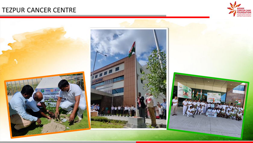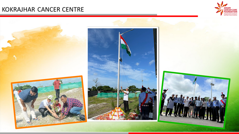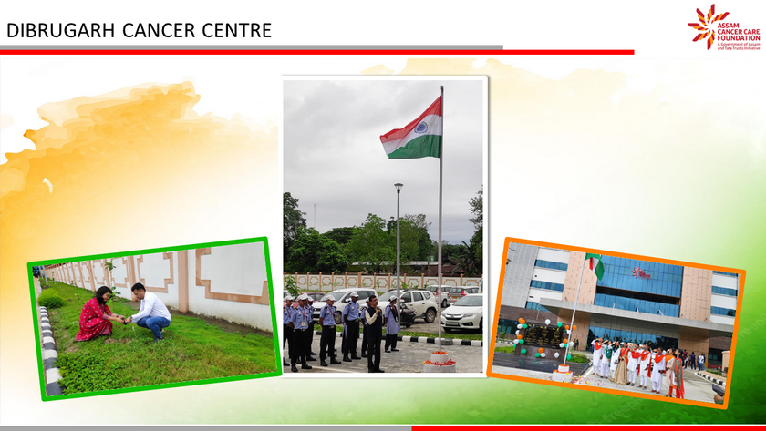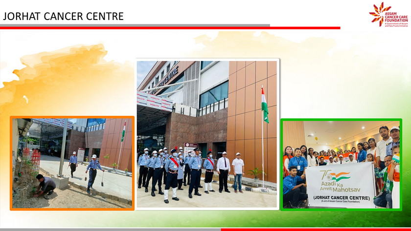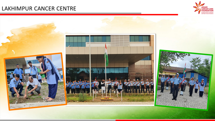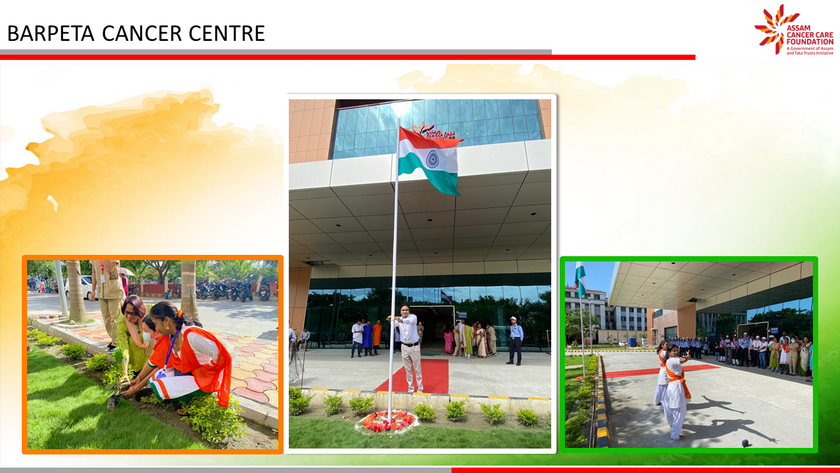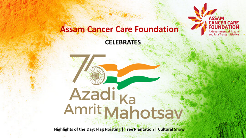 Assam Cancer Care Foundation celebrated 75th Independence Day across its units at Dibrugarh, Barpeta, Tezpur, Lakhimpur, Jorhat, Darrang and Kokrajhar. A ceremonial programme was organized at each location beginning with flag hoisting, followed by parade and cultural show. The highlight of the day was plantation of 75 trees in each location to mark the 75th year of Indian independence and an endeavour towards protection of the environment. The event was attended by members of respective units - doctors, nurses and staff members along with their families.