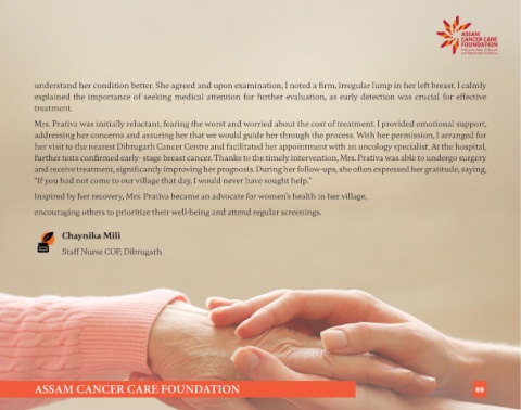 her visit to the nearest Dibrugarh Cancer Centre and facilitated her appointment with an oncology specialist. At the hospital,