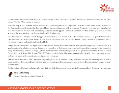 the Darrang Cancer Centre for further tests. There, she was diagnosed with oral cancer. The center provided her not only with