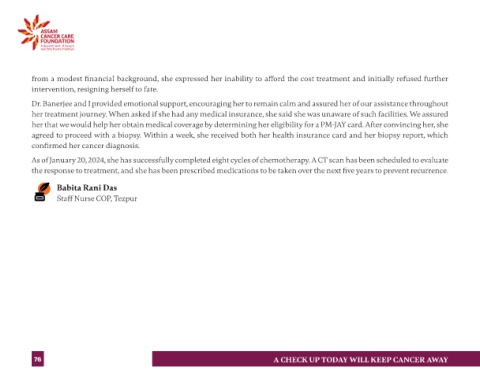 her treatment journey. When asked if she had any medical insurance, she said she was unaware of such facilities. We assured